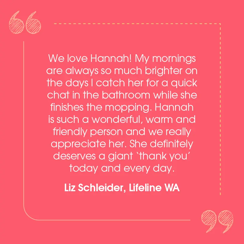 Hannah and Gary has been providing cleaning services to IMDEX since 2014.ย  Hannah does an incredible job at our Balcatta offices and regularly goes above and beyond to make sure that the office looks great and is clean when we start a new day.ย  Not only is Hannah great at what she does, she is also a wonderful human who is so helpful, kind, as well as having the patience of a Saint.