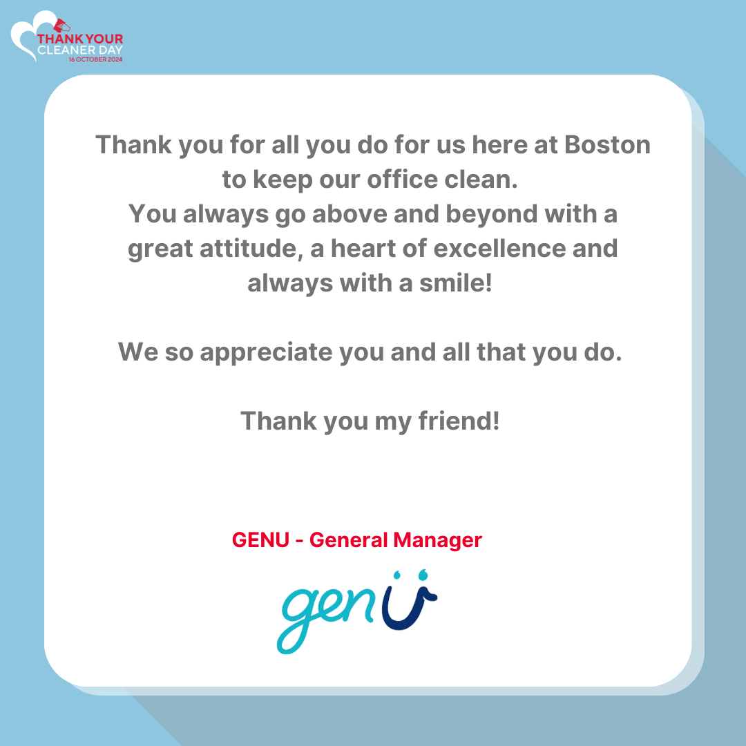 Your attention to detail and commitment to maintaining a spotless environment is truly appreciated. It’s because of your efforts that we can work in a comfortable and pleasant space. Thank you for your unwavering dedication and for always going above and beyond.
