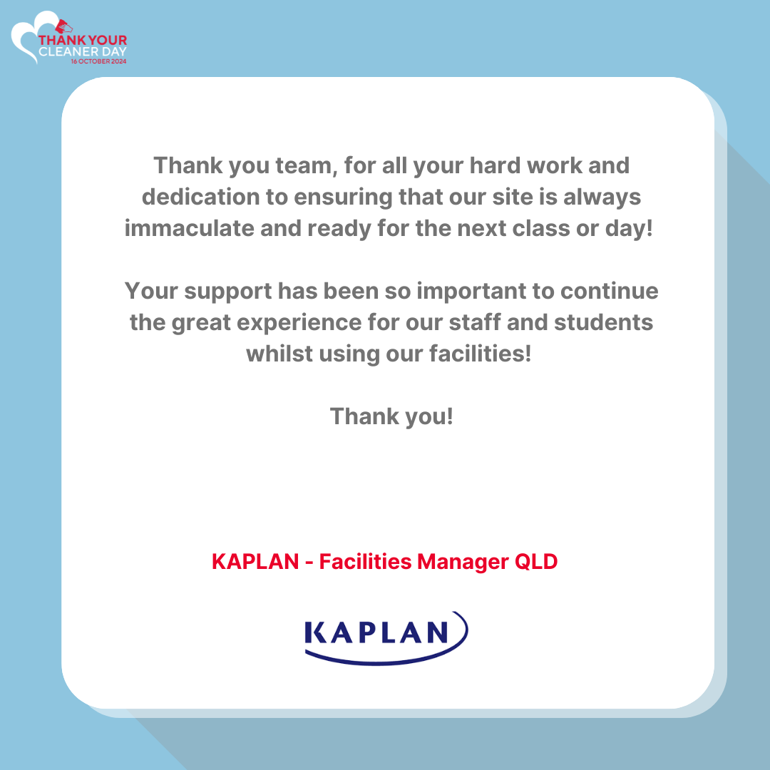 The work you do is essential to our daily operations, and we truly appreciate the effort and care you put into making our spaces welcoming for employees, clients, and visitors alike. Thank you for your continued dedication. We value your contributions and the difference you make everyday.